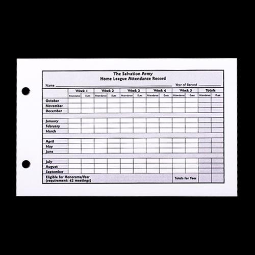 Home League Attendance Record. The Salvation Army Home League Attendance Record includes entries for member name, year of record, each month and week of attendance and dues paid. The back of the record has entires for member information, date of visit and results/comments of visits. Two-prong 5x8 sheet. Sold as a pad of 25.